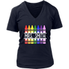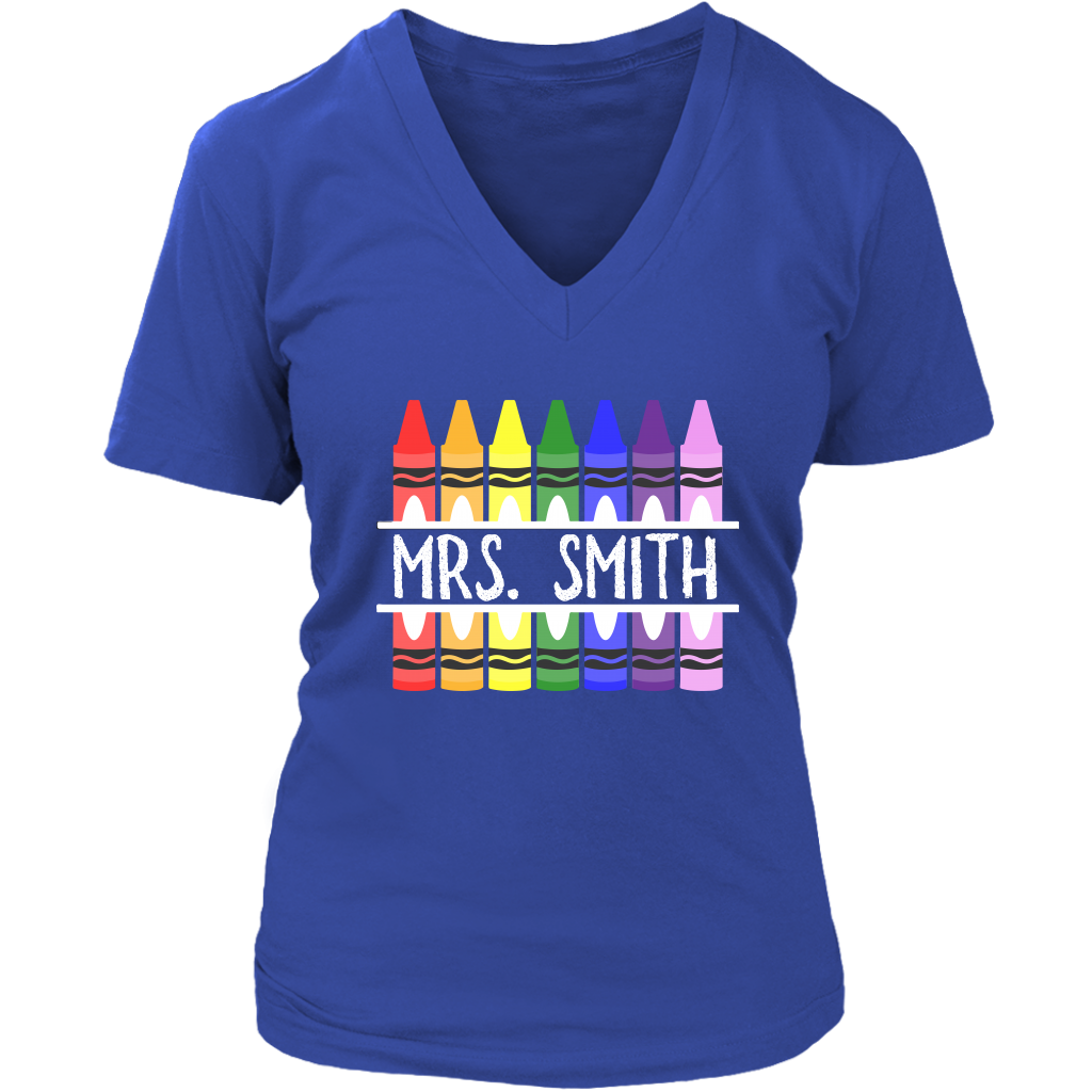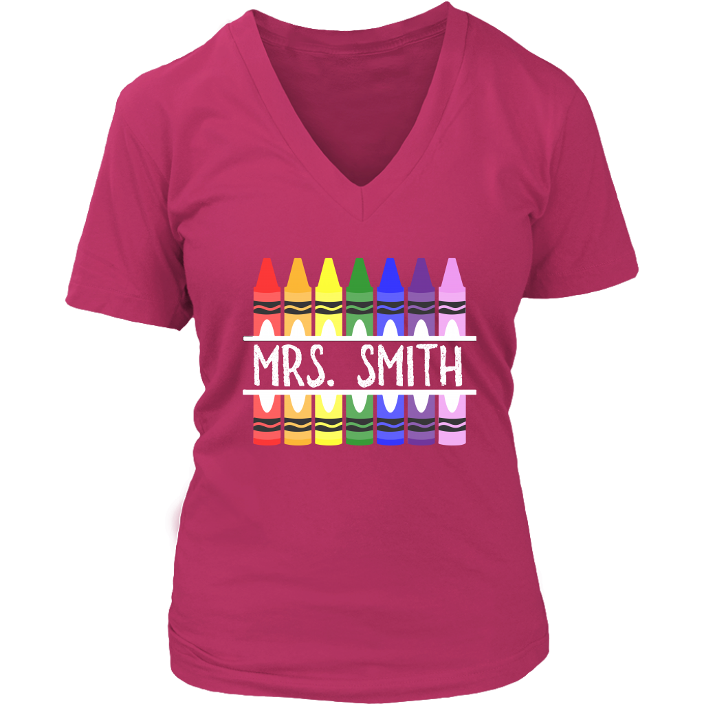 VnSupertramp Personalized Crayon Teacher Women V-Neck Shirt Custom Name Back To School Teacher Appreciation Gift